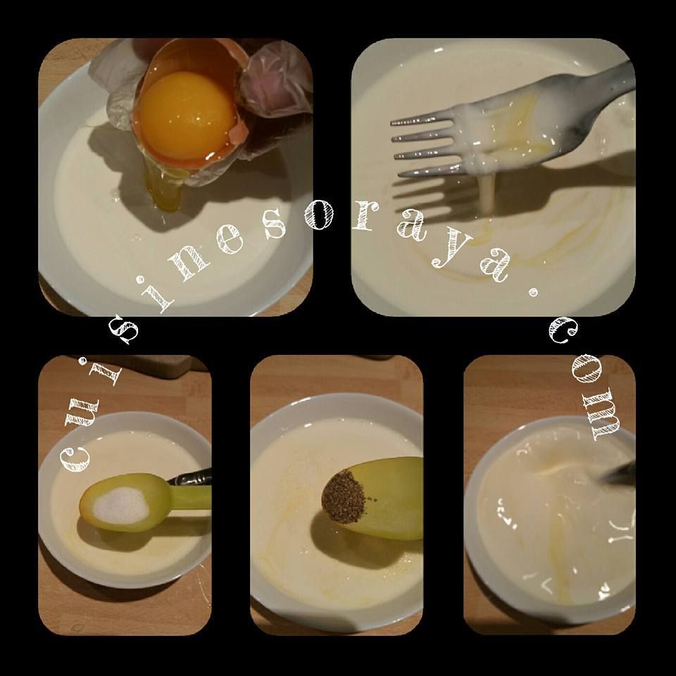 – Battre les 2 oeufs dans un grand bol, ajouter la crème, le sel et le poivre . Mélanger. Mélanger le tout.