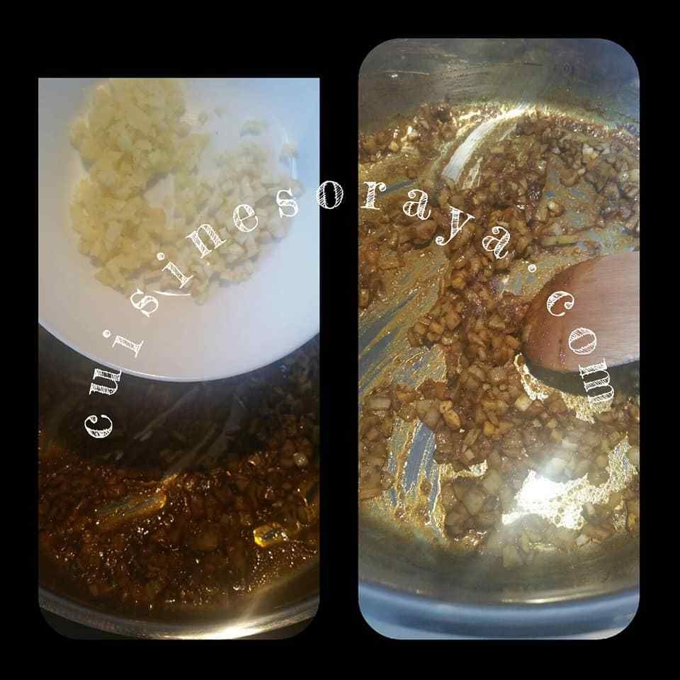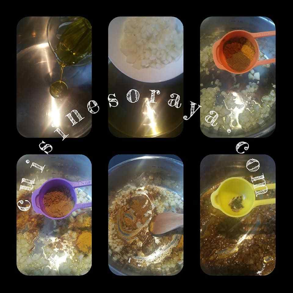 – Dans une sauteuse, mettre l'huile d'olive, ajouter les oignons, le cumin, le paprika, le curry, le curry madras, le curcuma, les graine de cardamone et mélanger jusqu'à une belle coloration.