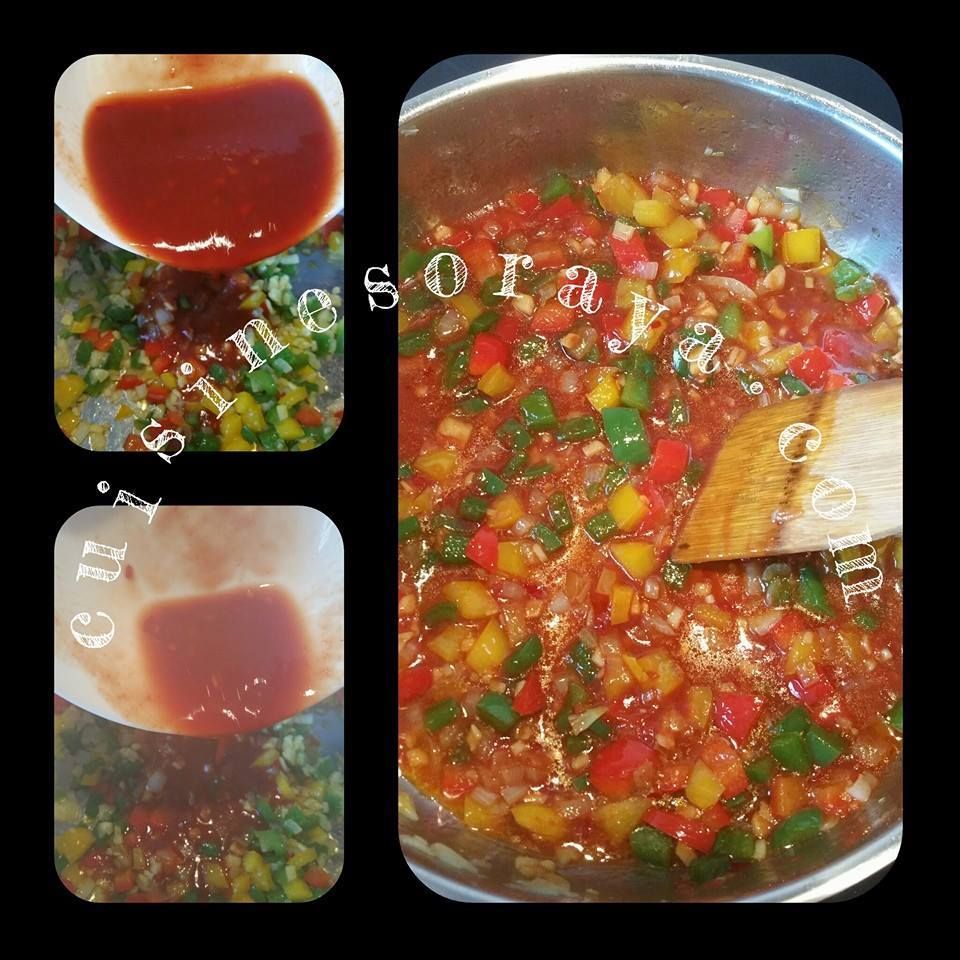 – Ajouter les poivron coupé en petits dés, saler et mélanger. Faites revenir environ 5 minutes, vérifier la cuisson des poivrons si vous aimez croquante ou non.