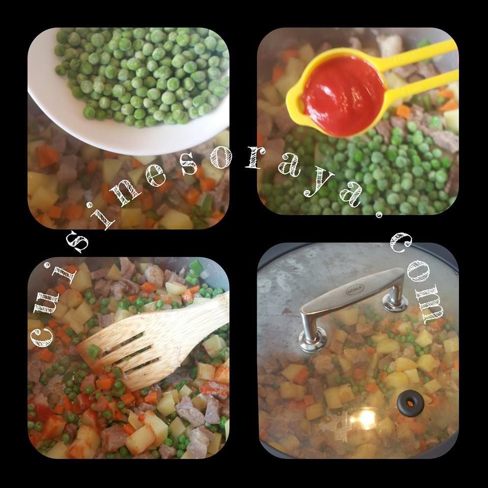 – Et enfin, ajouter les petits pois, la purée de tomate, mélanger. Couvrir et laisser mijoter environ 10 minutes.