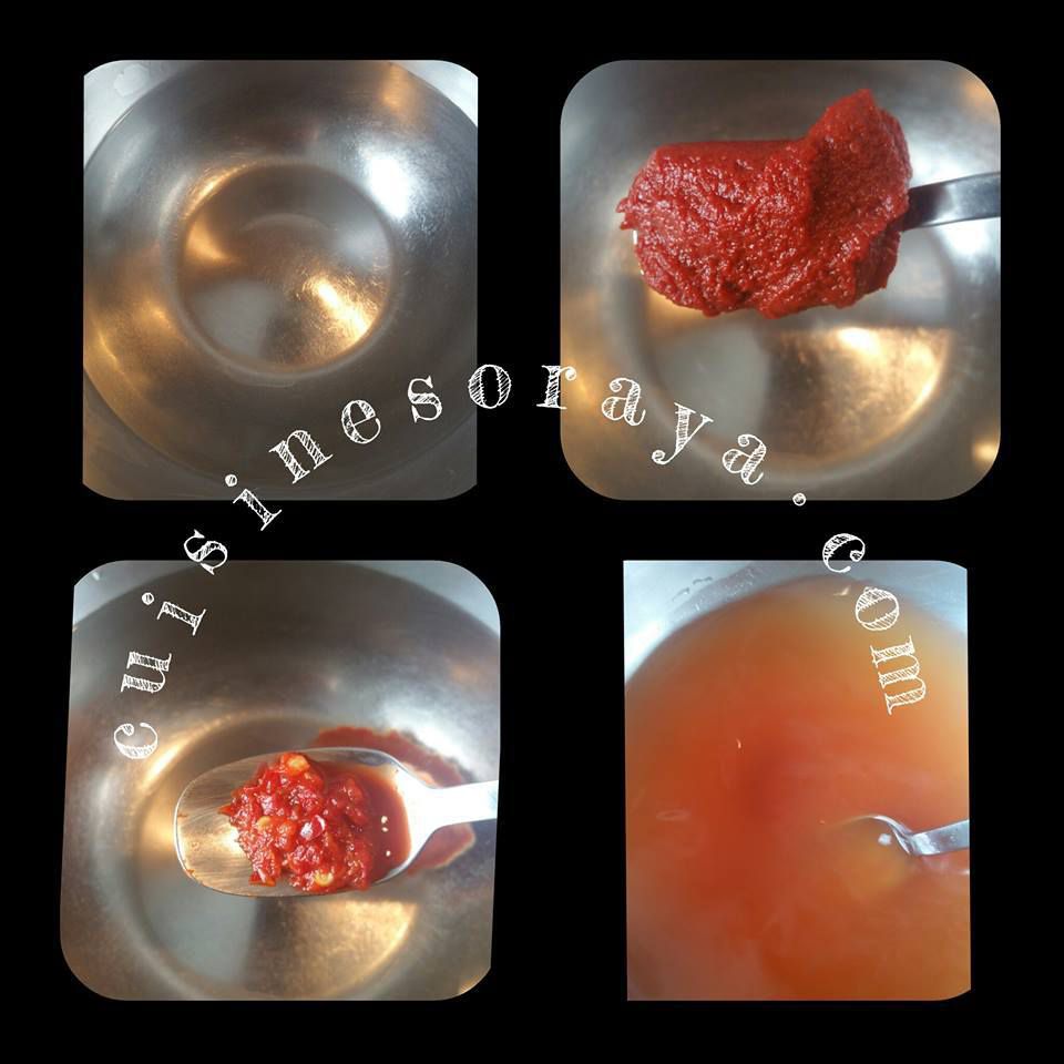– Dans un bol d'eau chaude, mettre la cuillère à soupe de concentré de tomate et la purée de piment. Mélanger.