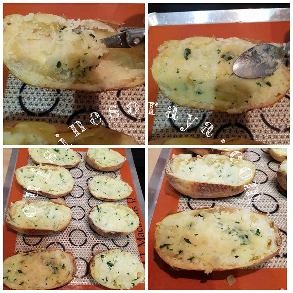– Opter la chair de la pomme de terre avec l'aide d'une cuillère et réserver dans un saladier.