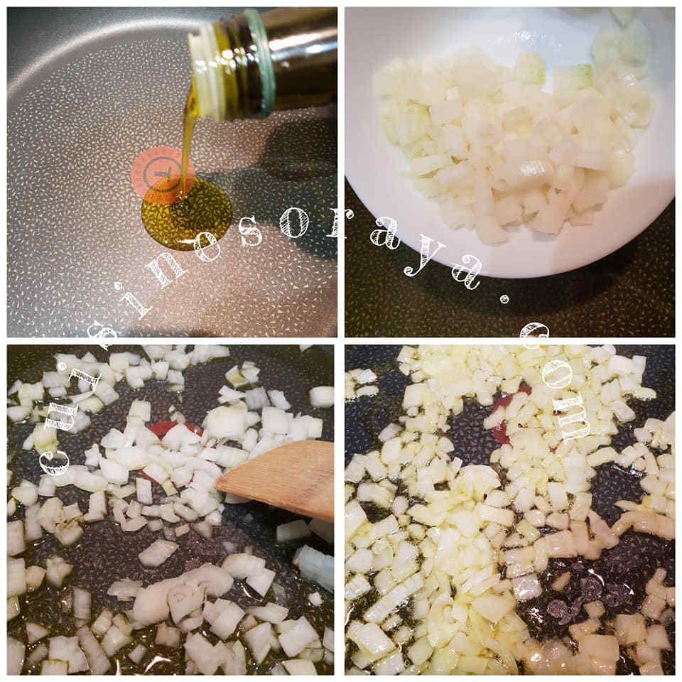 – Dans une poêle, mettre de l'huile d'olive, faire revenir les oignons. Réserver.