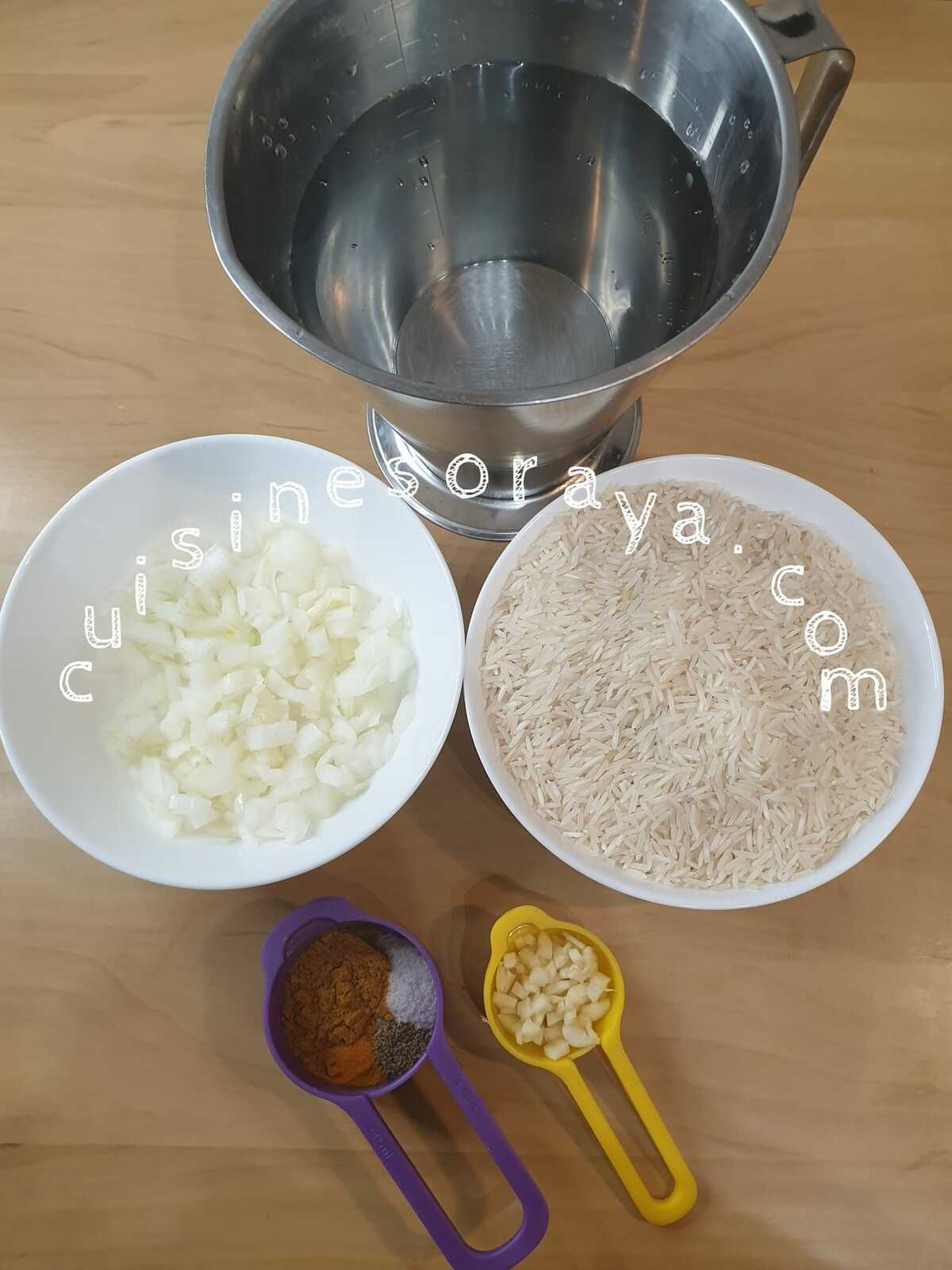 – Ajouter le riz basmati, du sel, poivre, curcuma, curry, bien mélanger et faire revenir quelques minutes.