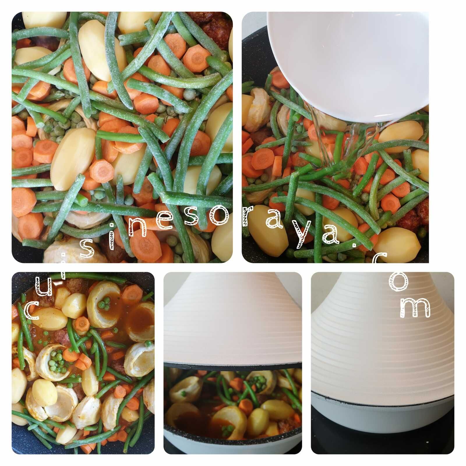 – Ajouter les fonds d'artichaud, les petits pois, les pommes de terre, les carottes et les haricots vert.