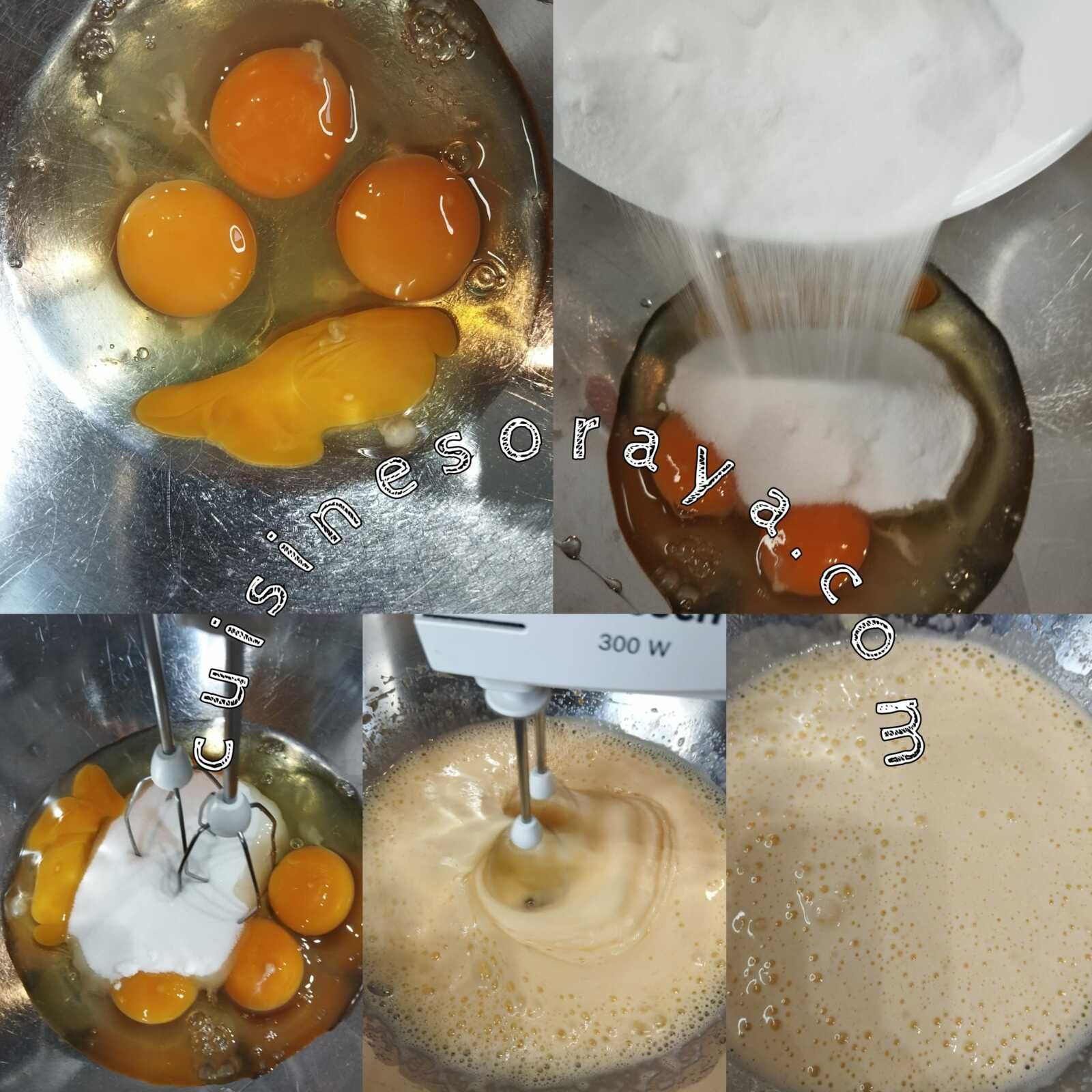 – Dans la saladier, cassez les oeufs entiers, versez le sucre et fouettez le tout pour un mélange mousseux jusqu'à ce que le mélange blanchise et double voir triple de volume.