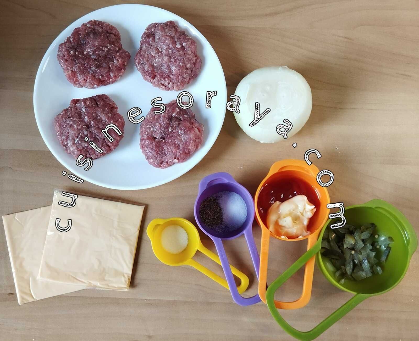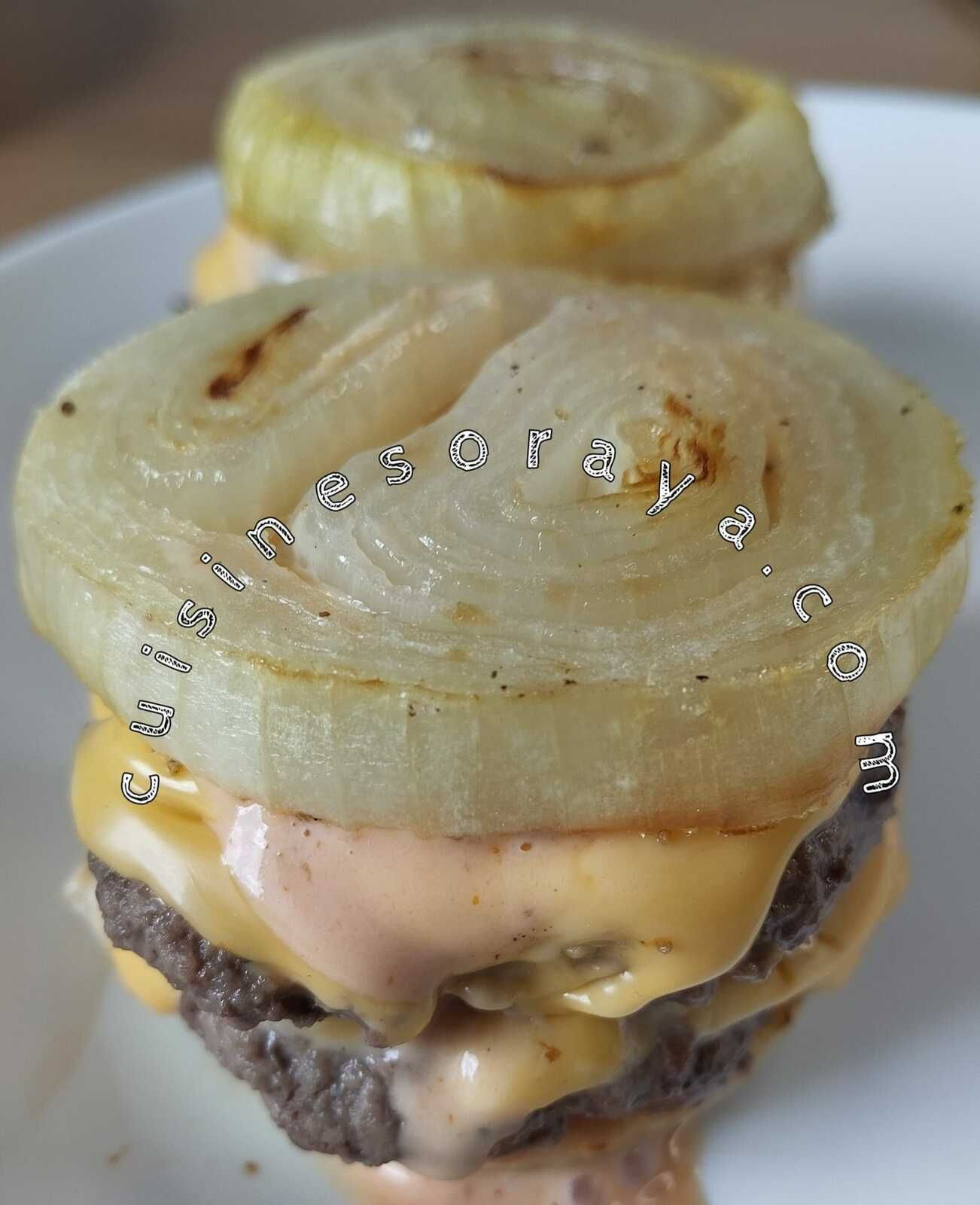 – Dresser, dans une assiette mettre une rondelle d'oignon, un peu de sauce, un steak, un autre steak par dessus, de la sauce et on referme avec une rondelle d'oignon.