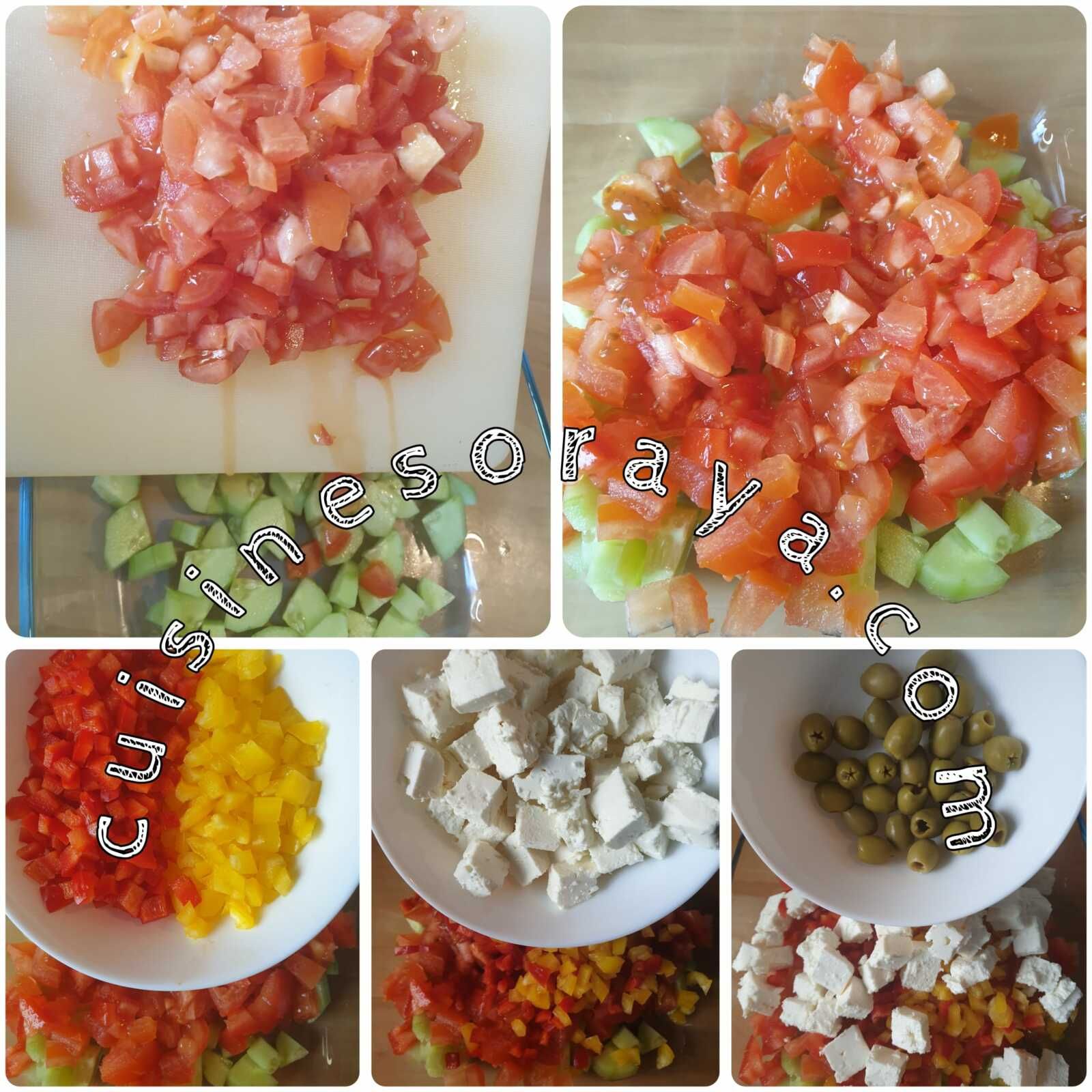 – Couper les tomates, versez dans le saladier avec les concombres, versez les poivrons, la fêta et les olives.