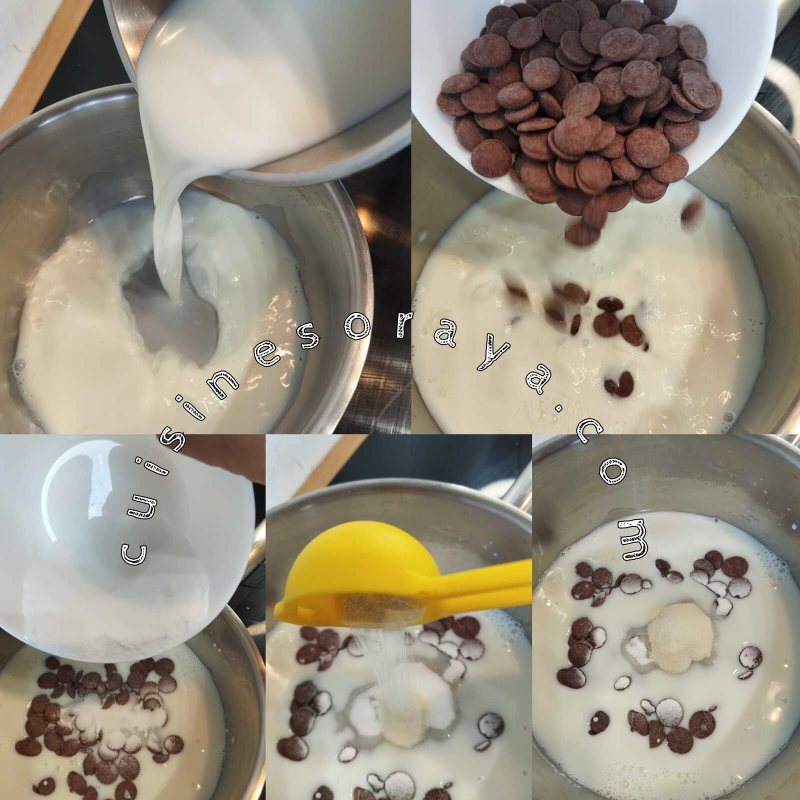 – Dans une casserole, versez le lait, le chocolat, le sucre et l'agar agar. Faites chauffer le tout à feu doux jusqu'à ébullition.