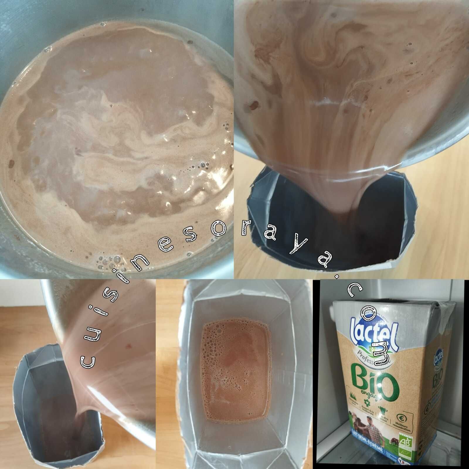 – Découper la brique de lait, nettoyer et essuyer et versez dans la brique de lait, bien propre et bien sèche. Mettre au frais 8 heures.