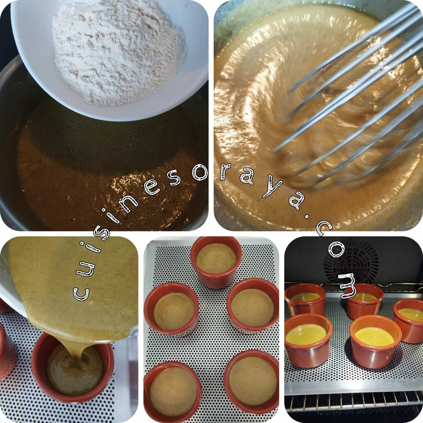 – Ajouter la farine, mélanger avec l'aide d'un fouet pour un mélange homogène et verser la pâte dans des ramequins. Enfournez dans un four préchauffer à 200°C pendant 9 minutes.