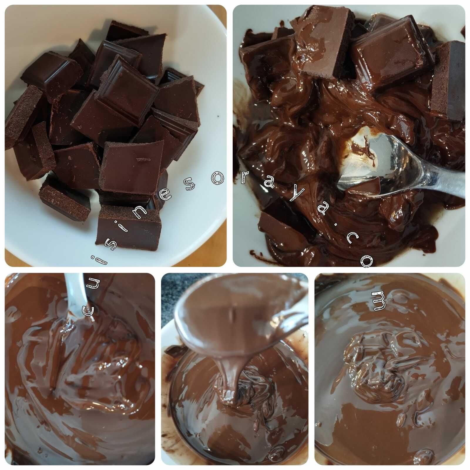 – Fondre le chocolat 2 fois 30 secondes au micro-onde en mélangeant entre les deux.