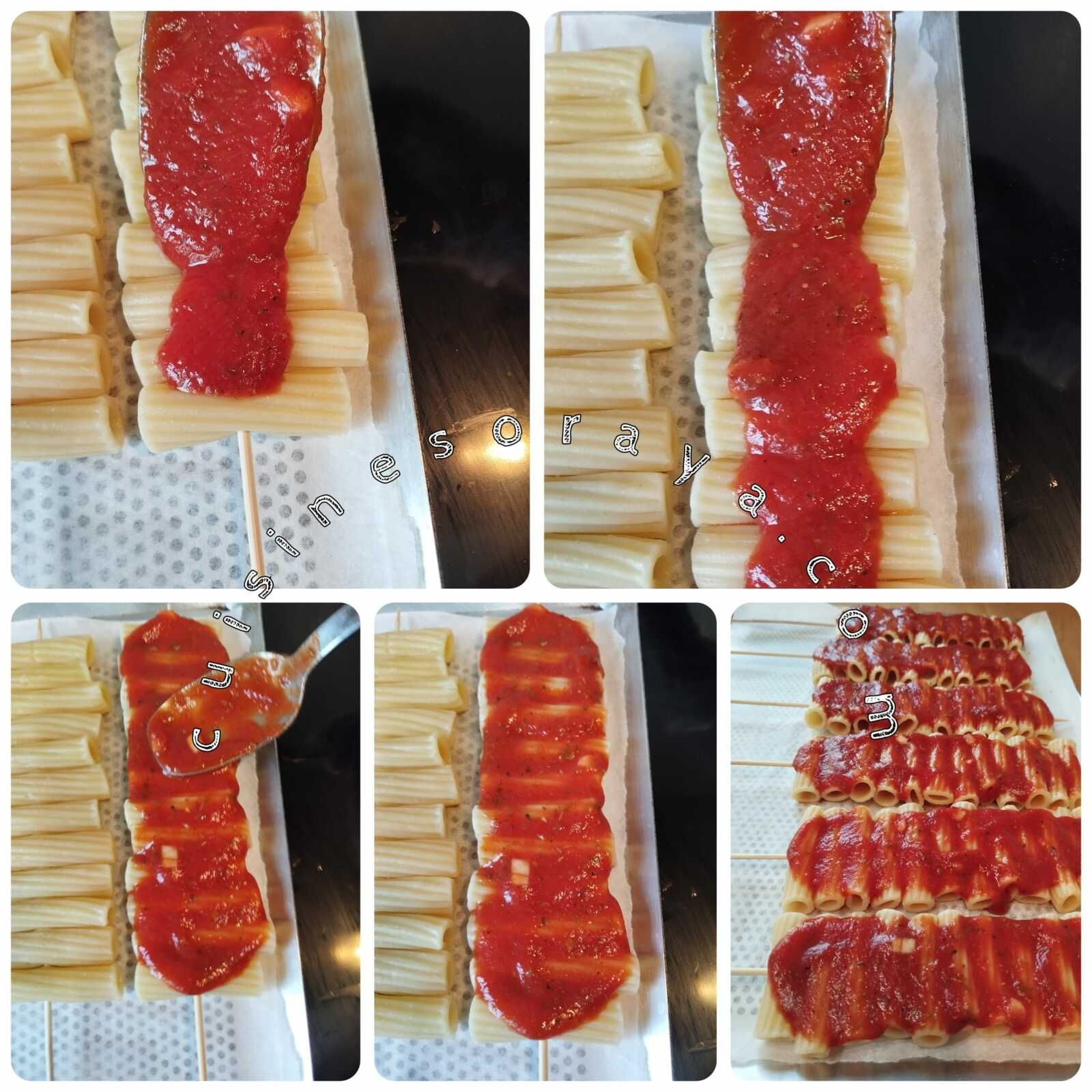 – Badigeonnez généreusement vos pâtes de coulis de tomates.