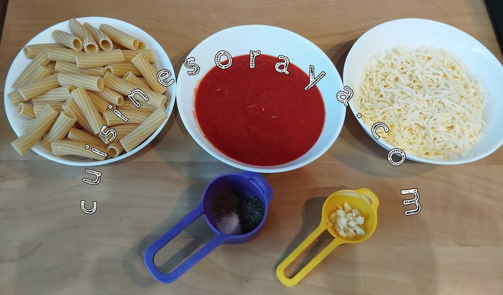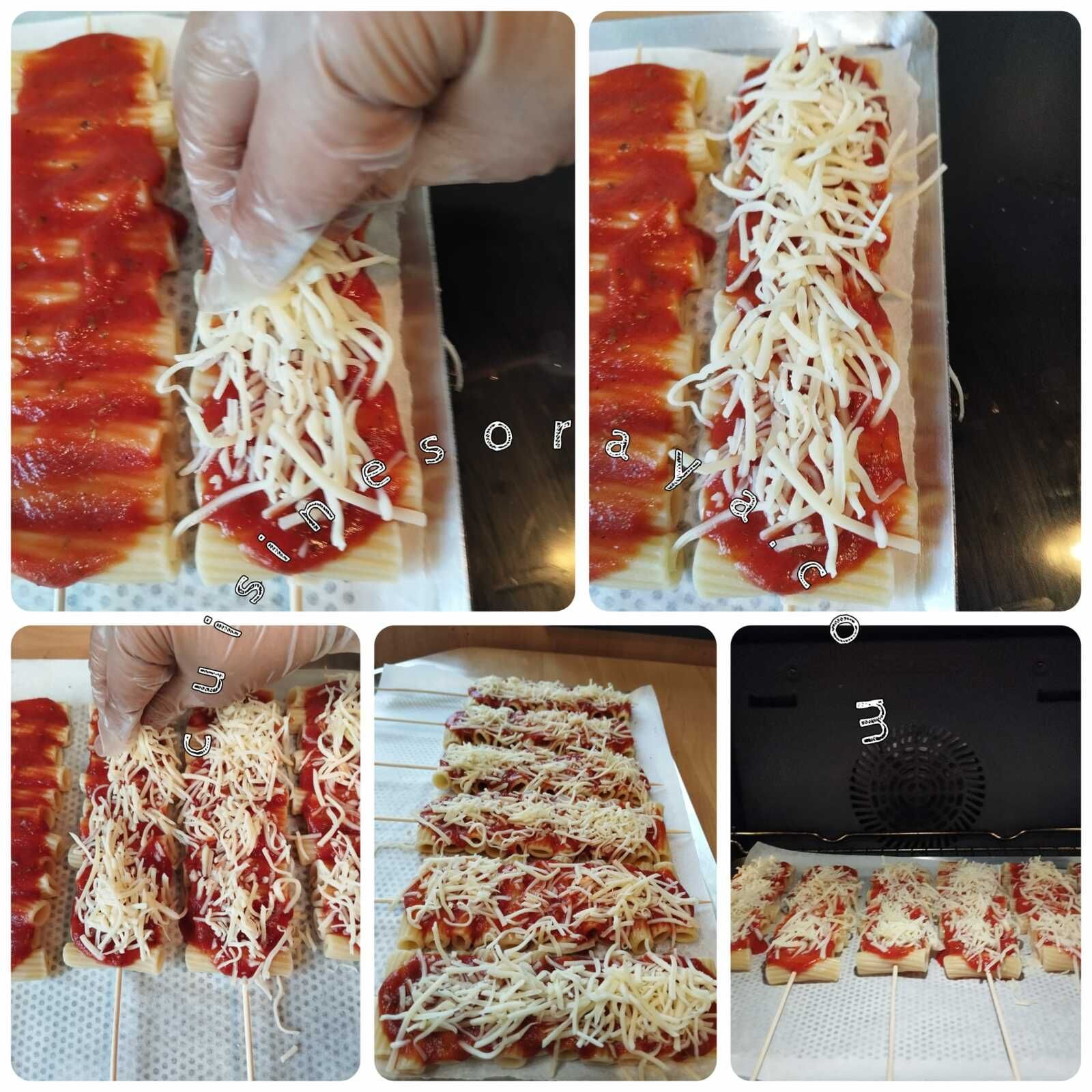 – Enfilez vos pâtes sur vos pics à brochettes et posez-les sur une plaque de cuisson recouverte de papier sulfurisé.