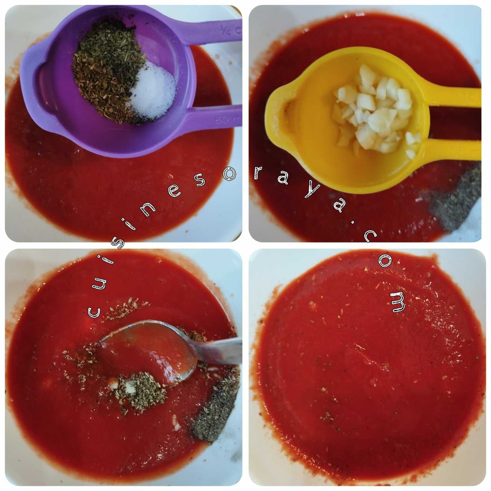 – Ajouter dans un bol ajouter la purée de tomate, le sel, le poivre, l'origan, l'ail et bien mélanger le tout. Réserver.