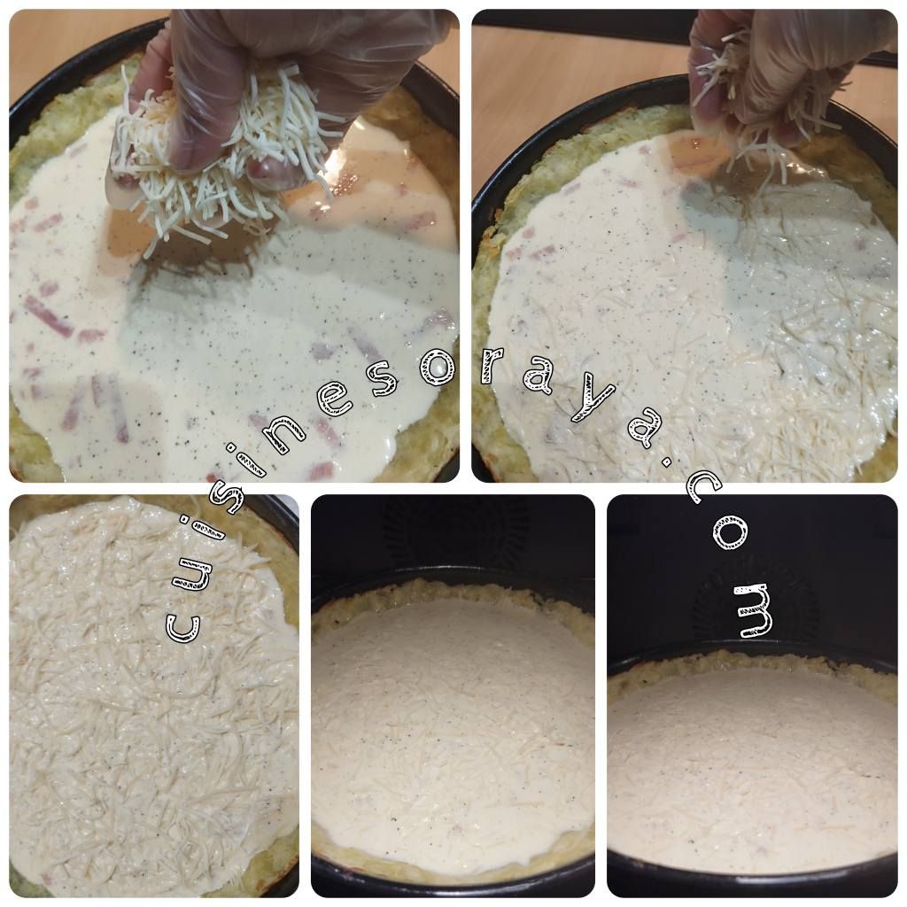 – Ajoutez les pommes de terre sur un plat allant au four munie de papier cuisson, écrasez-les et tassez afin de former un fond de tarte avec les bords. Ajoutez un filet d'huile d'olive sur le dessus. Enfournez pour une première cuisson à 200°C pendant environ 20 minutes selon votre four.